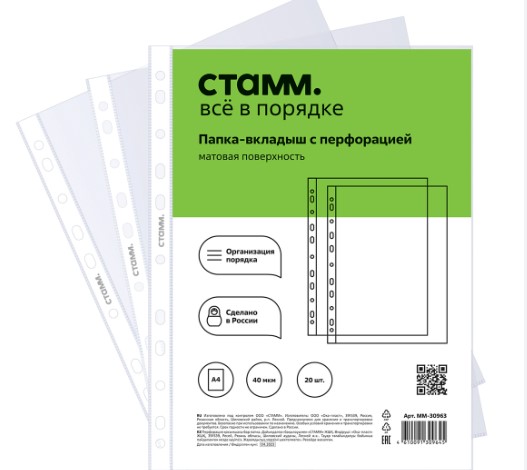 Папка-вкладыш с перфорацией (файл) СТАММ А4, 90мкм, матовая, (50 шт/уп), ММ-30981