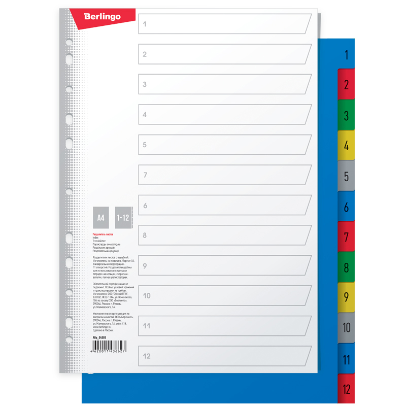 Разделитель листов 'Berlingo', А4, 12 листов, цифровой, 1-12, цветной, пластиковый, ARp_04080