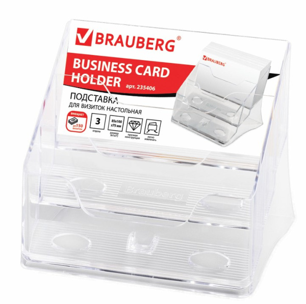 Подставка для визиток настольная BRAUBERG-CONTRACT, на 150 шт., 85х100х75 мм, 3 отделения, прозрачная, 235406