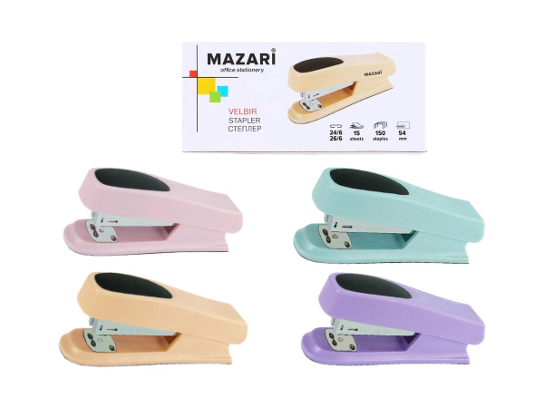 —Степлер № 24;6 - 26;6, VELBIR, 15 листов, ассорти 2 цвета, пластиковый корпус, M-6928