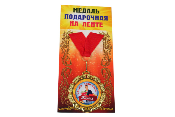 —Медаль подарочная на ленте металлическая Самый завидный жених D=6,5 см.