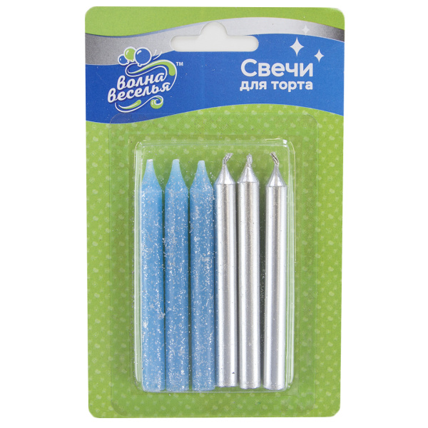 —Свечи Серебро;Голубой, Металлик, с блестками, 0,8х8 см, 6 шт, 620186SB