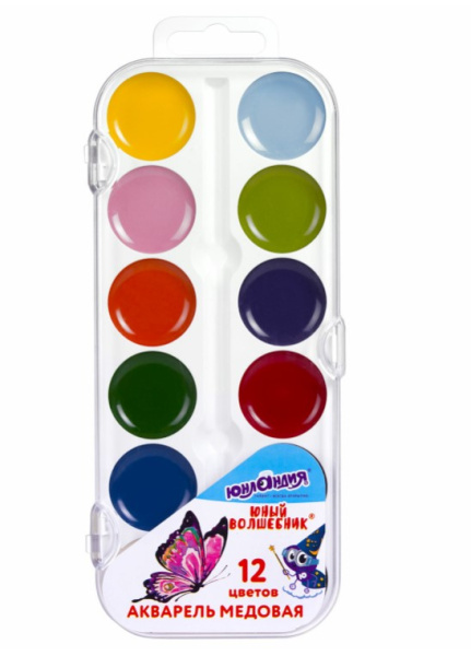 —Краски акварельные ЮНЛАНДИЯ 'ЮНЫЙ ВОЛШЕБНИК', медовые, 12 цветов, круглые кюветы, пластик, 192358